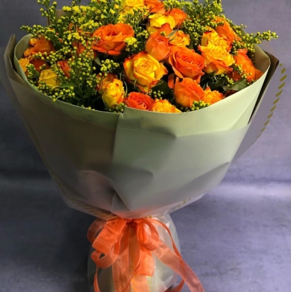 Букет из ярких кустовых роз с добавлением солидаго в стильной матовой упаковке